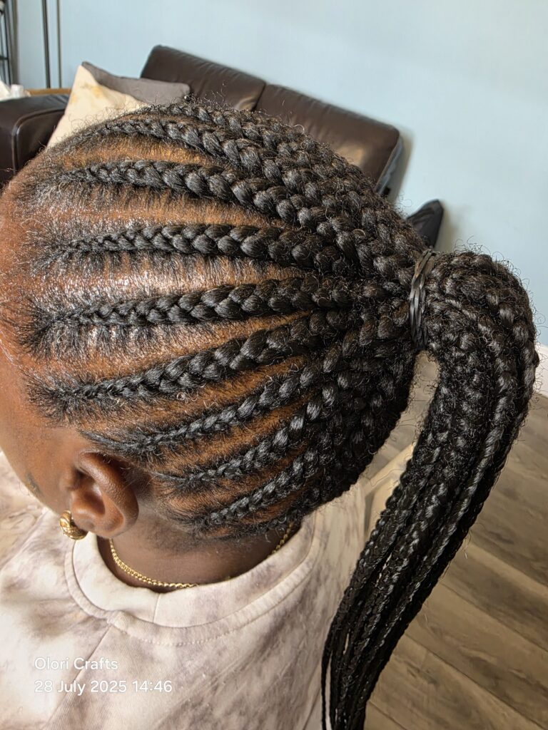 Sleek and neat cornrows styled into a high ponytail for an elegant finish.