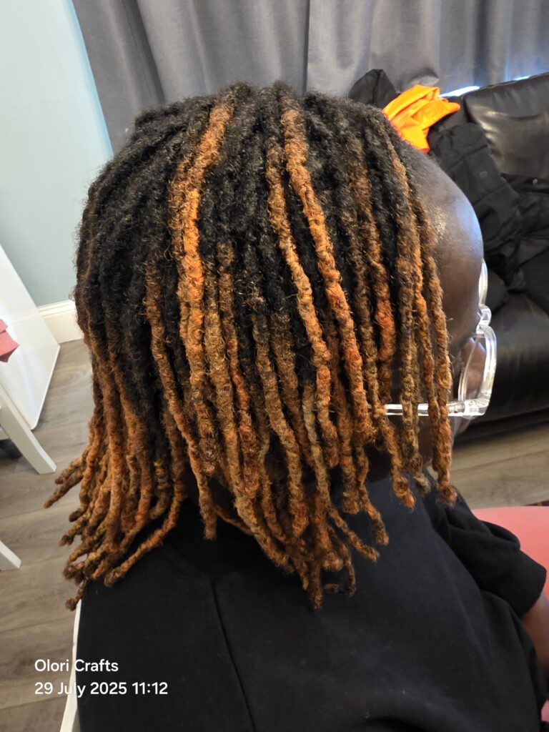 Neatly retwisted locs with copper highlights for a bold, defined look