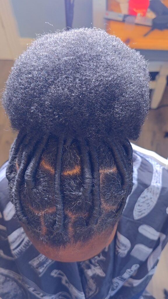 Natural locs styled into a tidy bun for a protective and professional look.